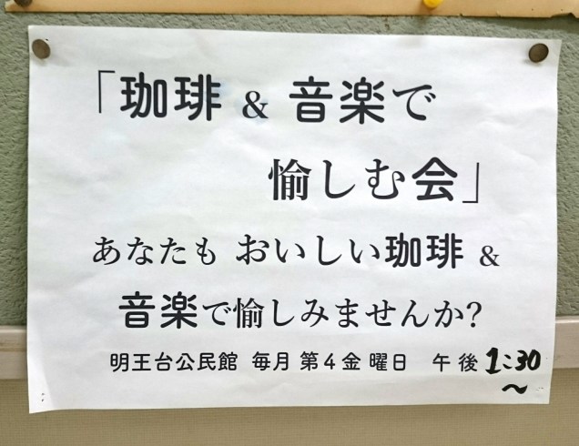 「珈琲 & 音楽で愉しむ会」 2016年12月18日2018年9月15日rengokaiyakuin 公民館で発見! 毎月第4金曜日、午後1時30分から。 お問い合わせは明王台公民館まで。 第4回 珈琲&音楽で愉しむ会(クリスマス特集) 日時:2016年12月23日(祝)13:30~ 場所:福山市明王台公民館 共有: クリックして X で共有 (新しいウィンドウで開きます) X Facebook で共有するにはクリックしてください (新しいウィンドウで開きます) Facebook いいね 読み込み中… 関連