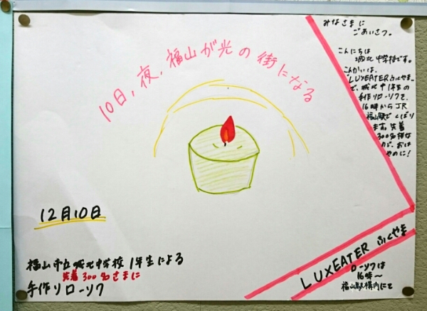 残念ながら、もう終わったイベントですが、ルクシアタふくやまの点灯式に、城北中学校の生徒さんが協力していたようです。