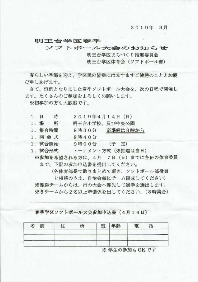 明王台学区春期ソフトボール大会のお知らせ 画像 2019年4月2日rengokaiyakuin 共有: クリックして X で共有 (新しいウィンドウで開きます) X Facebook で共有するにはクリックしてください (新しいウィンドウで開きます) Facebook いいね 読み込み中… 関連