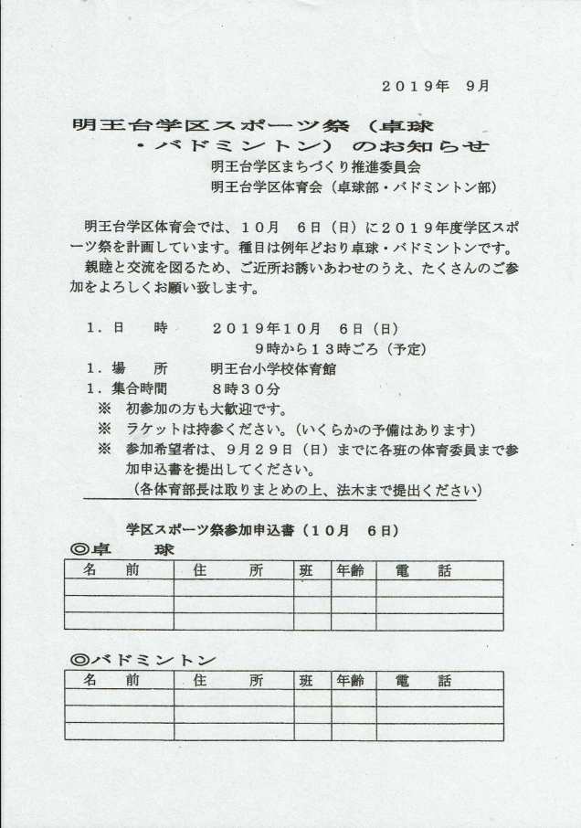 明王台学区スポーツ祭(卓球・バドミントン)のお知らせ 2019年9月30日rengokaiyakuin 共有: クリックして X で共有 (新しいウィンドウで開きます) X Facebook で共有するにはクリックしてください (新しいウィンドウで開きます) Facebook いいね 読み込み中… 関連