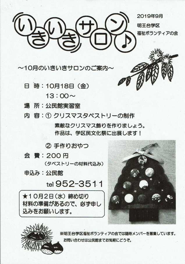 10月のいきいきサロンのご案内 2019年9月30日rengokaiyakuin 共有: クリックして X で共有 (新しいウィンドウで開きます) X Facebook で共有するにはクリックしてください (新しいウィンドウで開きます) Facebook いいね 読み込み中… 関連