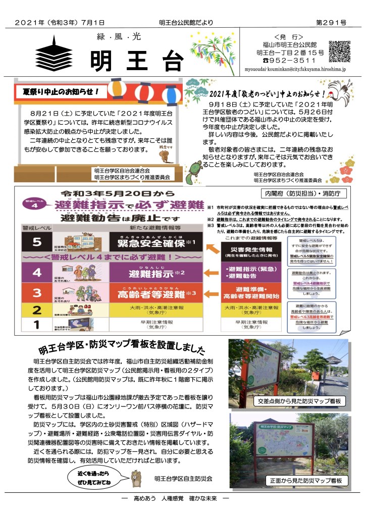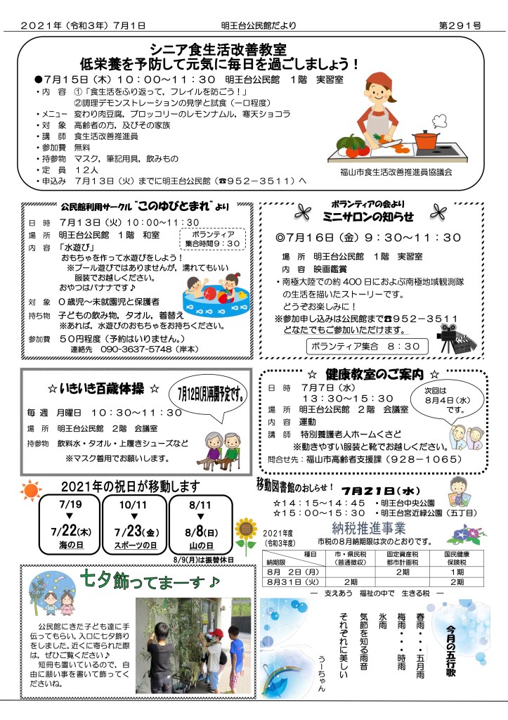 明王台公民館だより 第291号が発行されました 2021年7月1日2021年7月1日rengokaiyakuin ※公民館より各戸に配布した公民館だよりの裏面「2021年の祝日が移動します」欄で「8/8(木)」としておりましたが、正しくは8/8(日)です。ホームページ上のデータは訂正しております。 共有: クリックして X で共有 (新しいウィンドウで開きます) X Facebook で共有するにはクリックしてください (新しいウィンドウで開きます) Facebook いいね 読み込み中… 関連