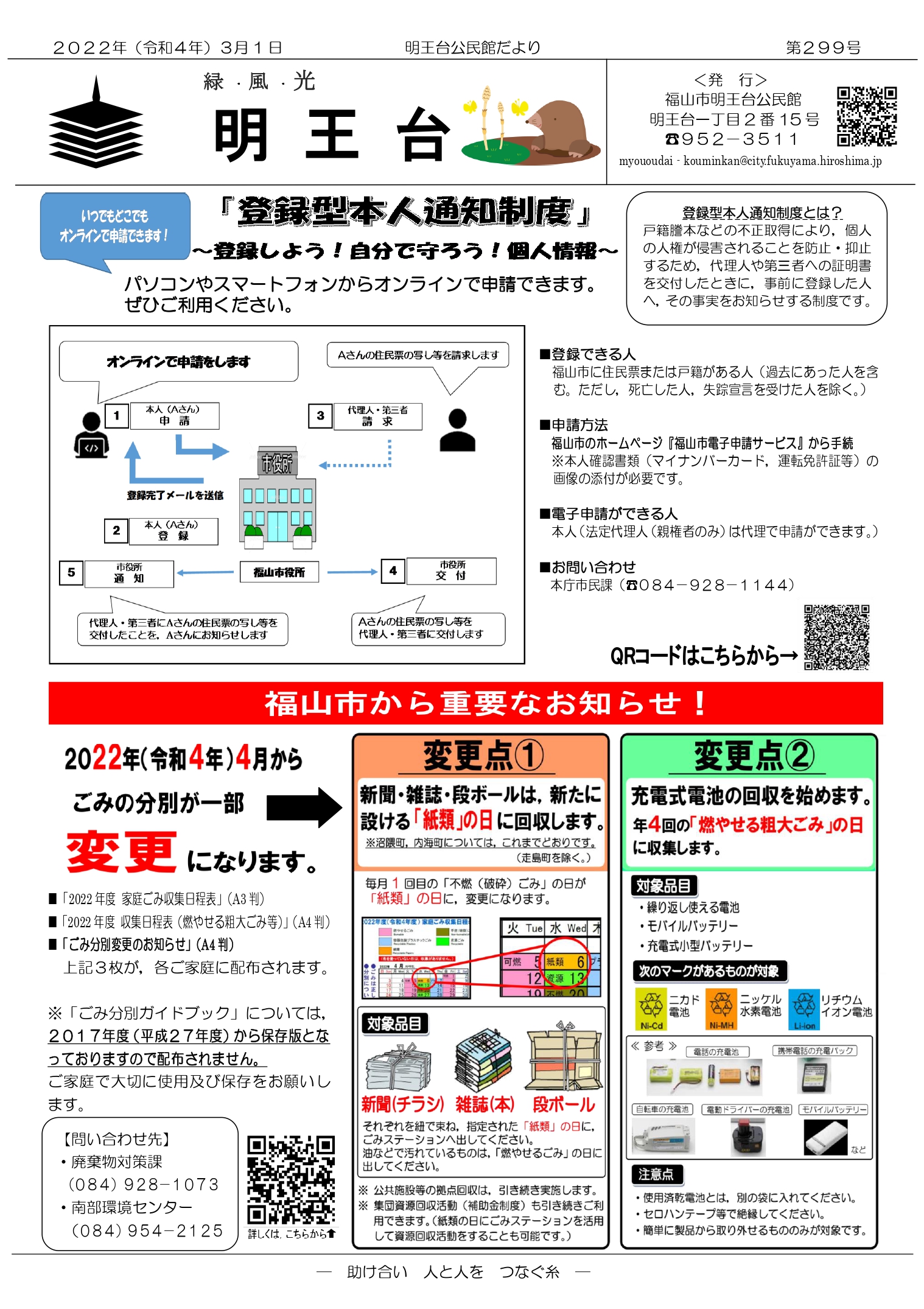 明王台公民館だより 第299号が発行されました 2022年3月3日2022年3月3日rengokaiyakuin QRコードのリンク先「登録型本人通知制度」「ごみの分別が一部変更になります」 共有: クリックして X で共有 (新しいウィンドウで開きます) X Facebook で共有するにはクリックしてください (新しいウィンドウで開きます) Facebook いいね 読み込み中… 関連
