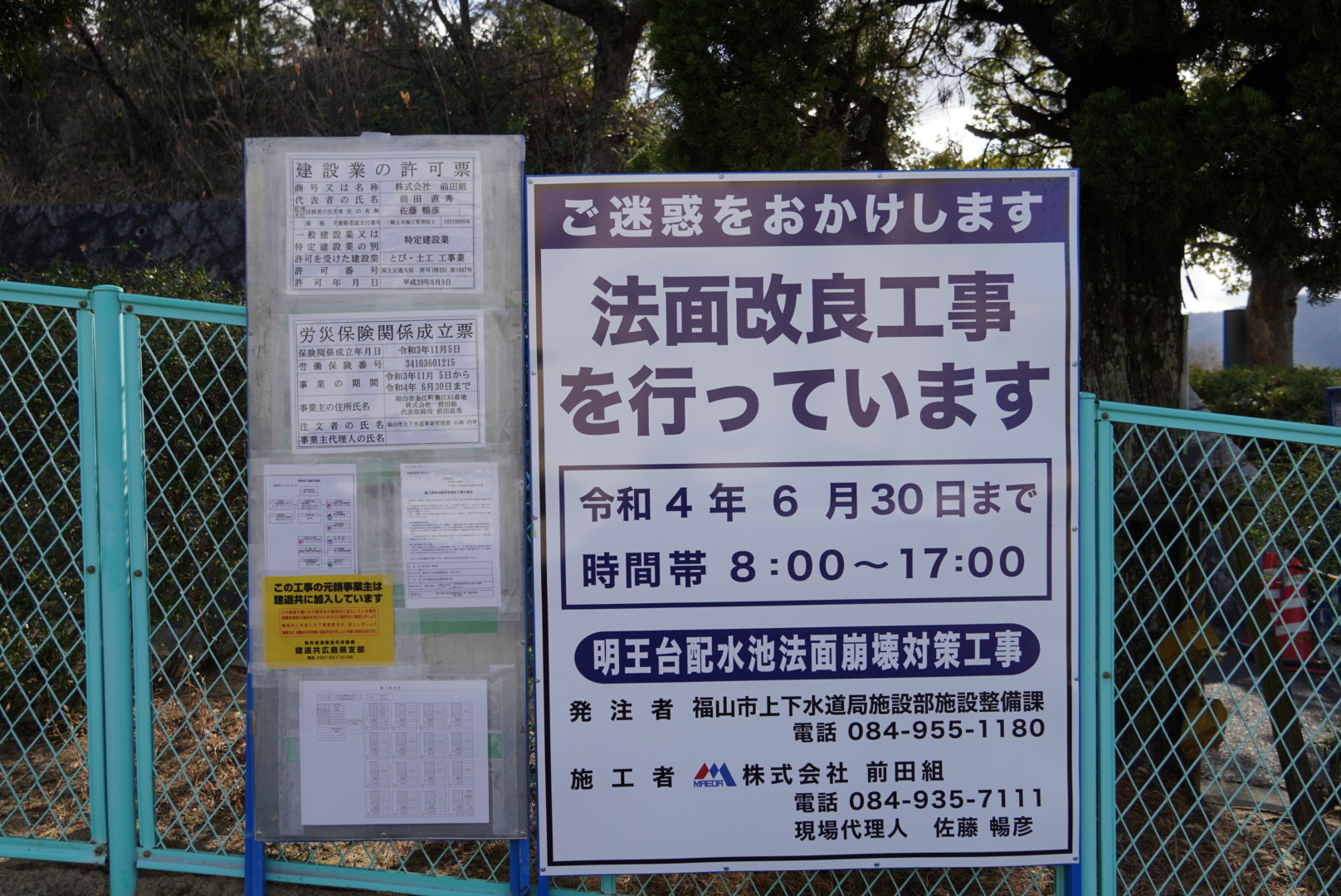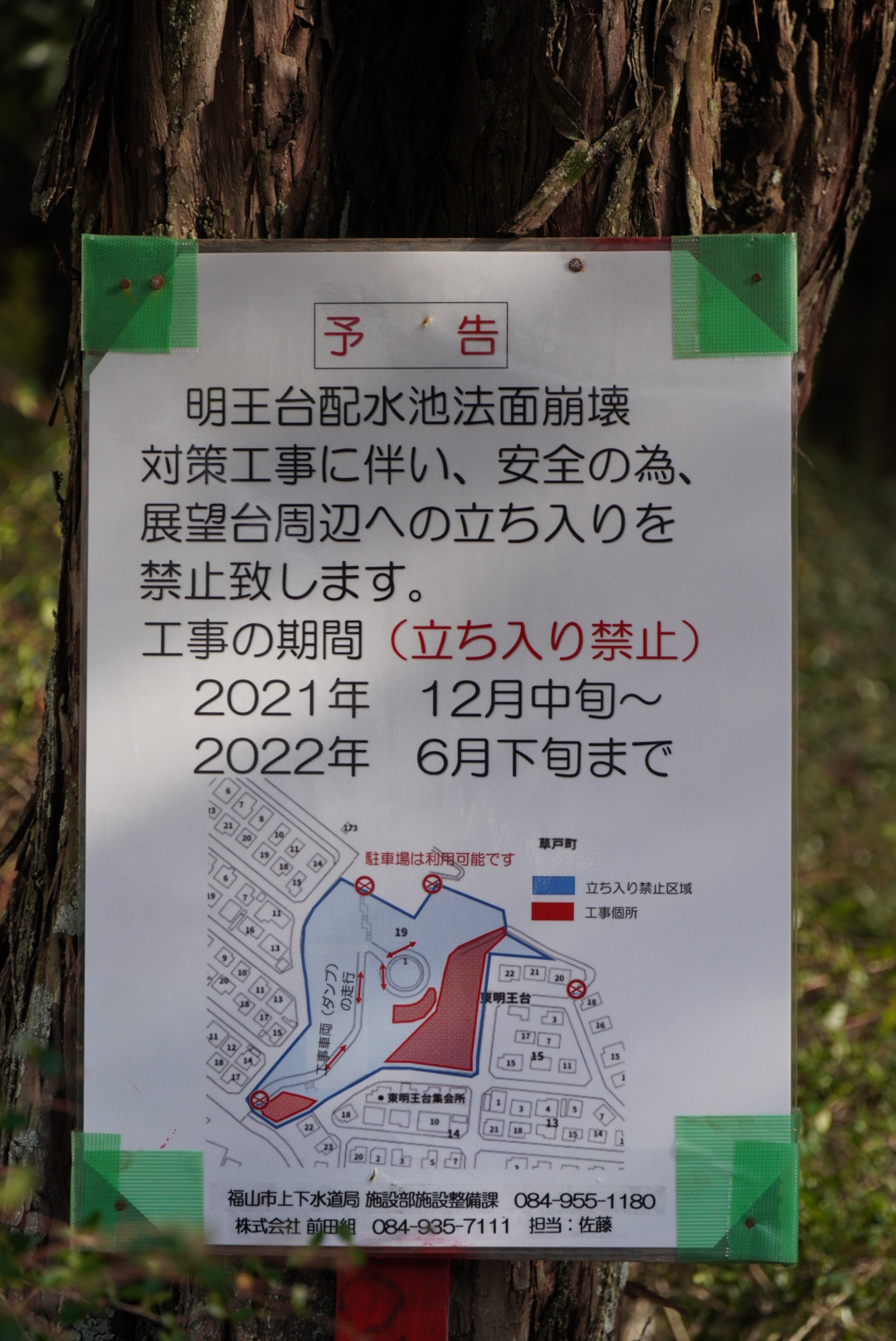 2021年12月中旬〜2022年6月下旬まで、明王台配水池法面崩壊対策工事に伴い、安全の為、展望台周辺への立ち入りを禁止致します。