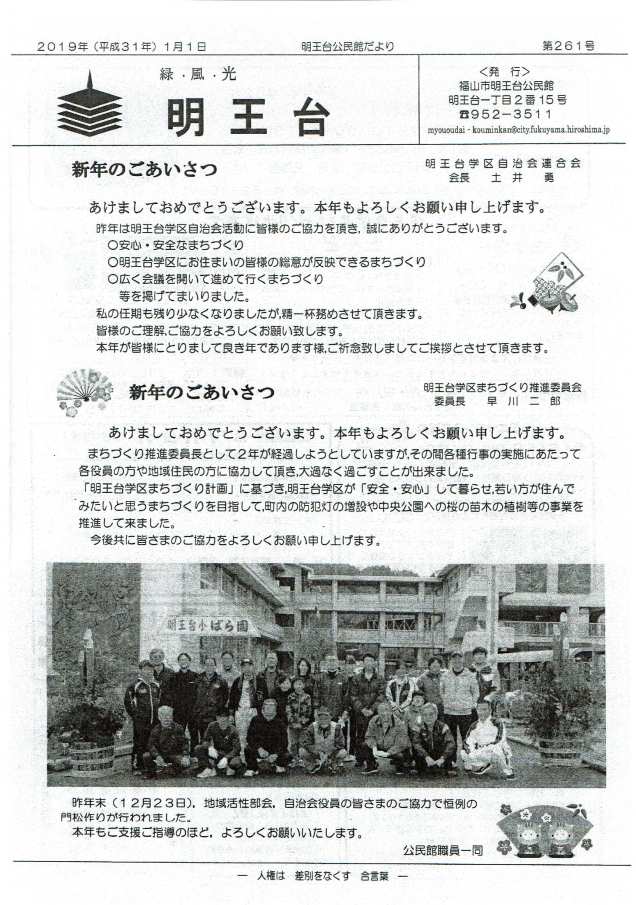 とんどの竹取りです 2019年1月14日2019年1月14日rengokaiyakuinコメントを残す 今日は午前10時から明王台公民館で餅つき、午後1時から明王台小学校グランドでとんどが行われます。 ぜひご参加ください。 共有: クリックして X で共有 (新しいウィンドウで開きます) X Facebook で共有するにはクリックしてください (新しいウィンドウで開きます) Facebook いいね 読み込み中…