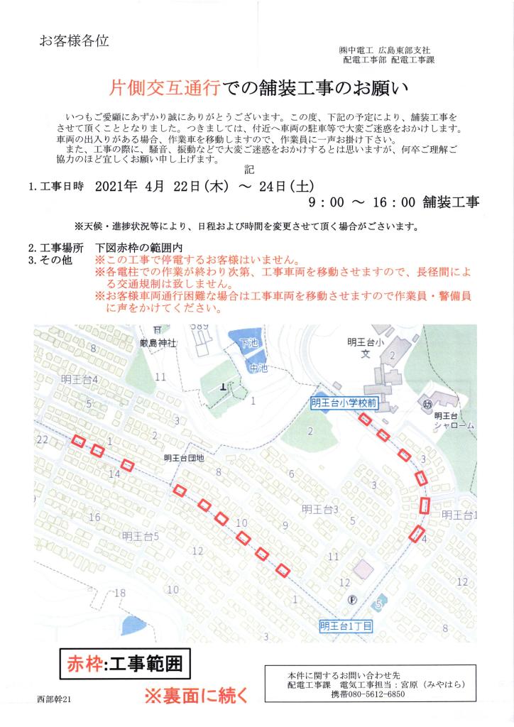(株)中電工さんから「片側交互通行での舗装工事のお願い」をいただきましたので掲載します。移動時にはご注意ください。