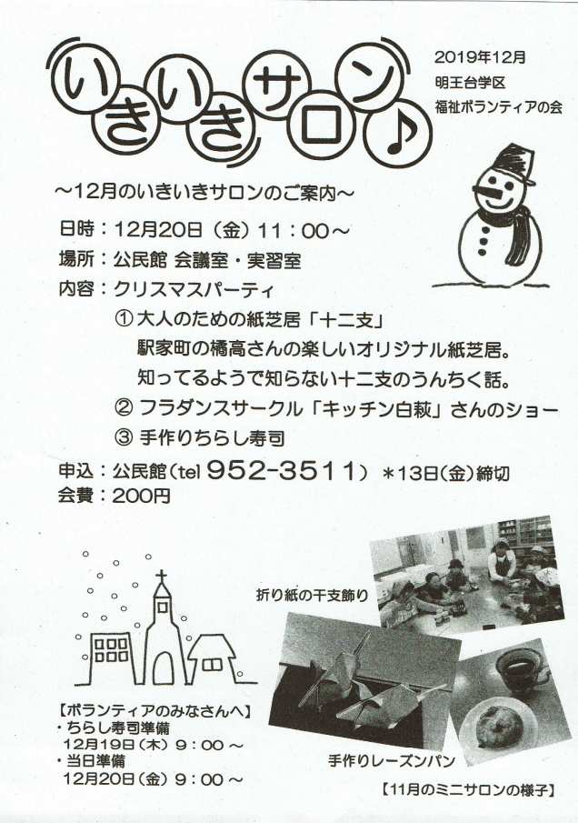 12月のいきいきサロンのご案内 2019年12月5日rengokaiyakuinコメントを残す 共有: クリックして X で共有 (新しいウィンドウで開きます) X Facebook で共有するにはクリックしてください (新しいウィンドウで開きます) Facebook いいね 読み込み中…