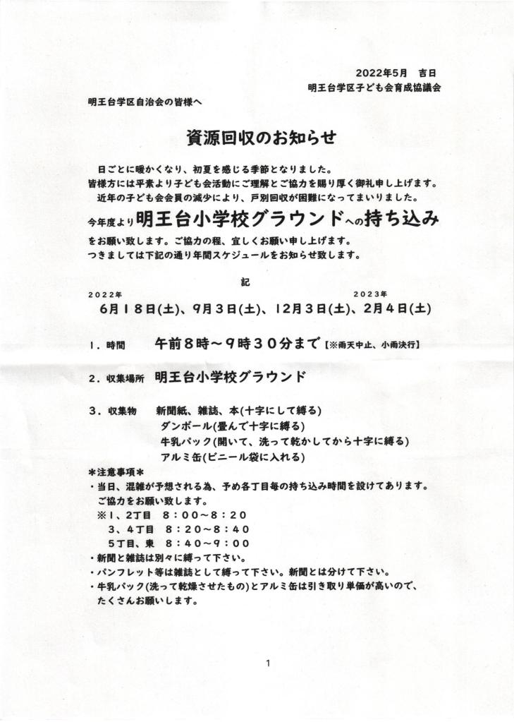今週土曜日2月4日の午前8時~9時30分まで、明王台小学校グラウンドで子ども会の資源回収が行われます。