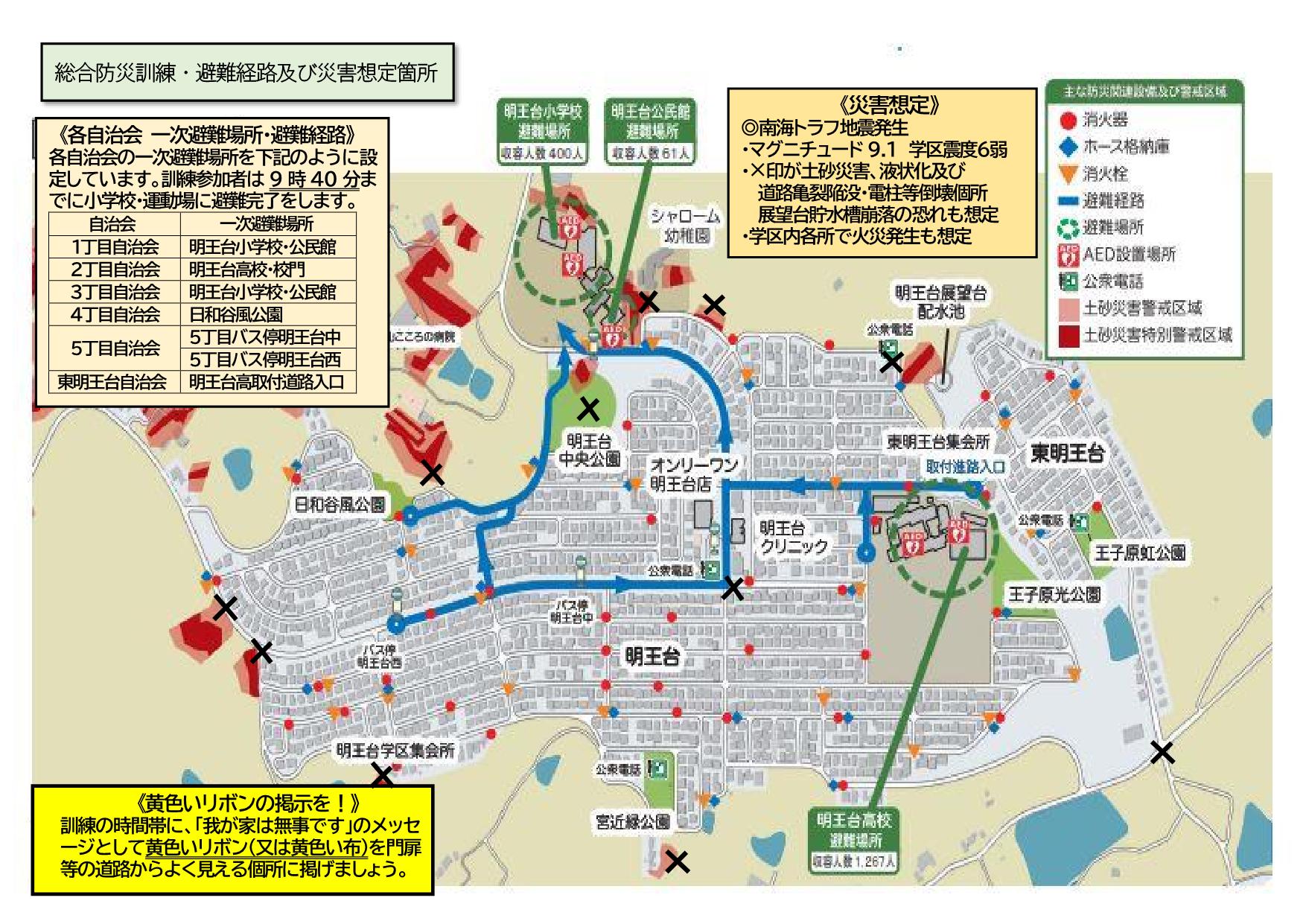 また、学区総合防災訓練では、毎年、自宅でも訓練に参加できる形態として「黄色いリボン」(我が家は全員無事の目印)掲示運動を推進しています。本年度は、全世帯の約30%(約420世帯)が掲示して頂き、大きな前進をみました。