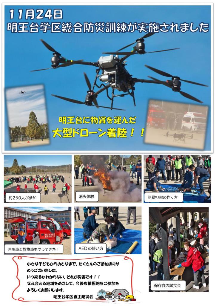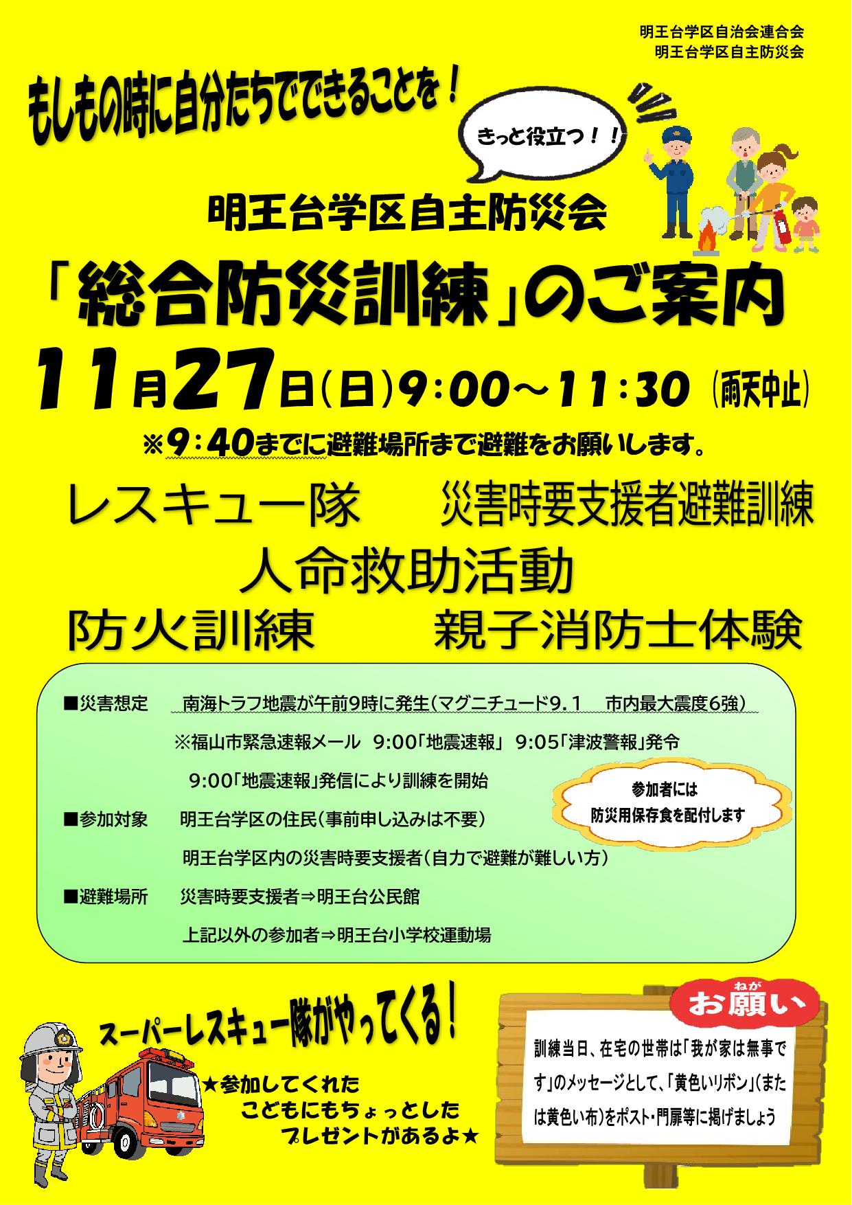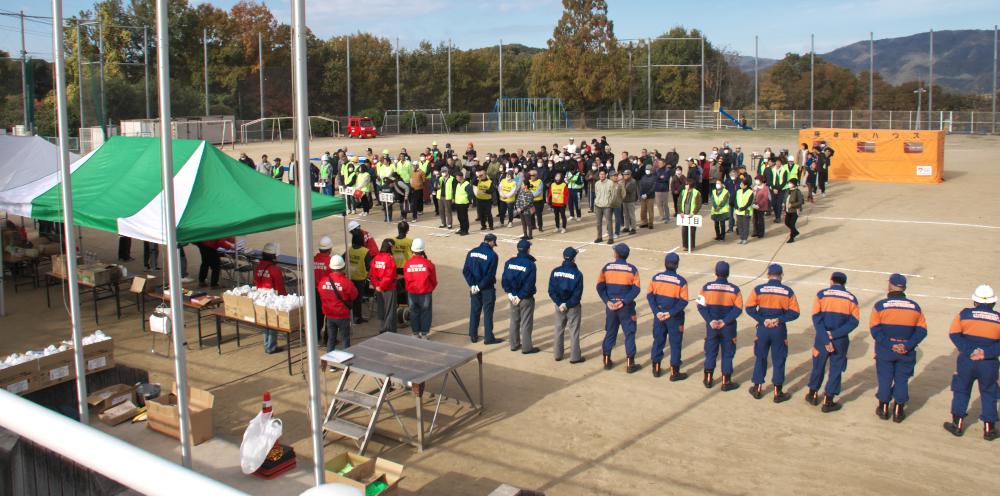 11月27日(日)、秋晴れのもと、明王台小学校運動場で明王台学区自主防災会主催の総合防災訓練を実施しました。
