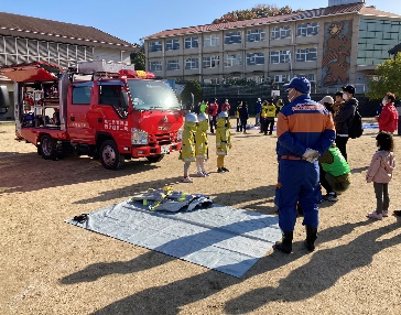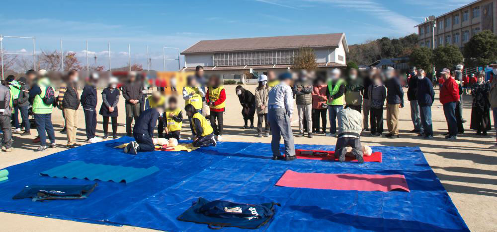 この防災訓練には、学区住民・自治会役員等、159名の参加がありました。昨年に続いて南消防署スーパーレスキュー隊の協力を頂き、人命救助活動のデモンストレーション見学や消防署隊員・消防団員の指導のもとで、消火器・AEDの取り扱いや簡易担架作成等を実践的に体験し、「防災」に関わる基本的な知識・技能を学習する機会になりました。