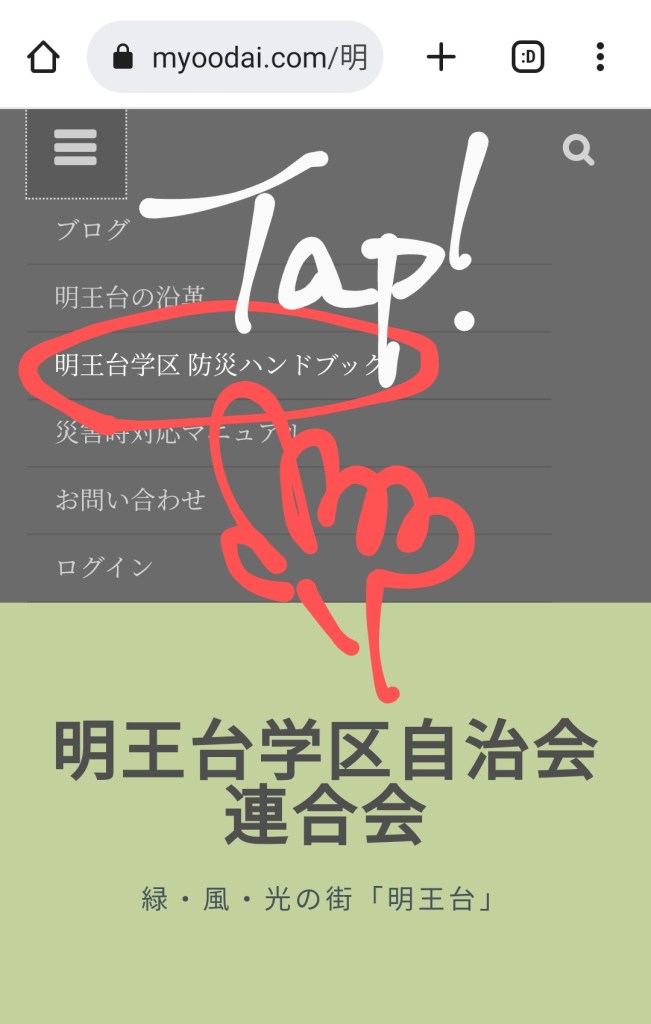 PCのブラウザでは以下のように表示されていると思いますので、「明王台学区 防災ハンドブック」をクリックしてください。