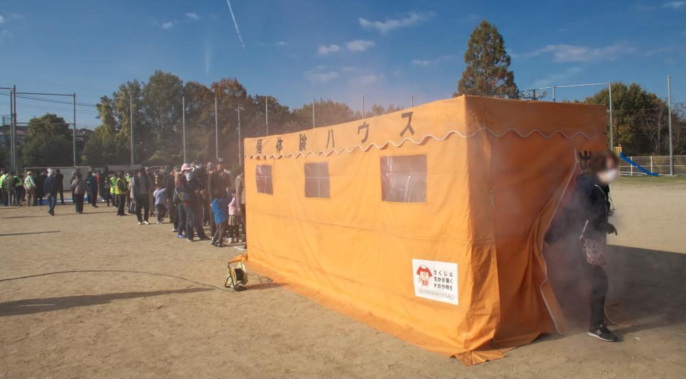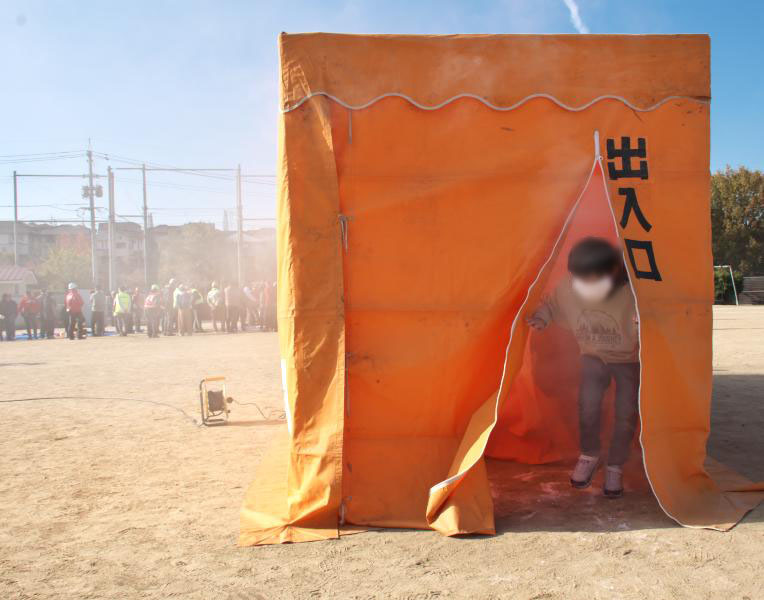 各自治会から合計210名の参加者があり、防災煙体験訓練・救急救命訓練・親子消防士体験・要支援者支援訓練・放水訓練・給食給水訓練などを体験しました。